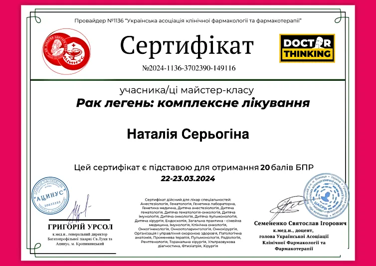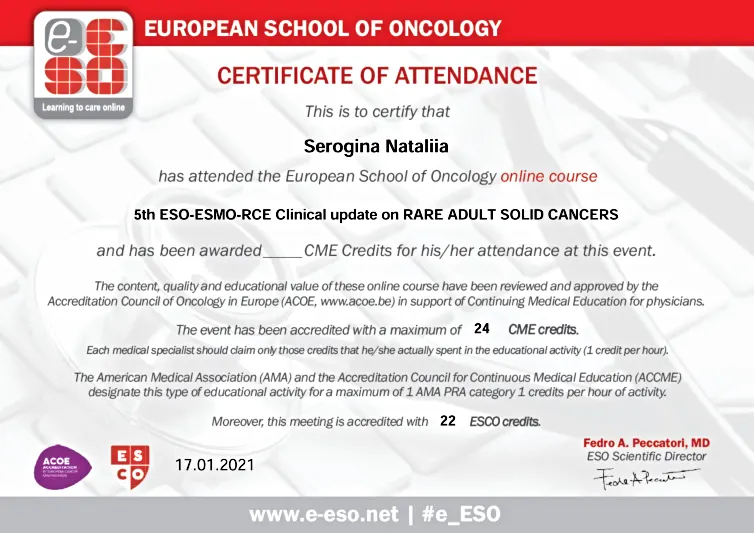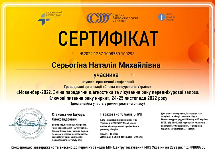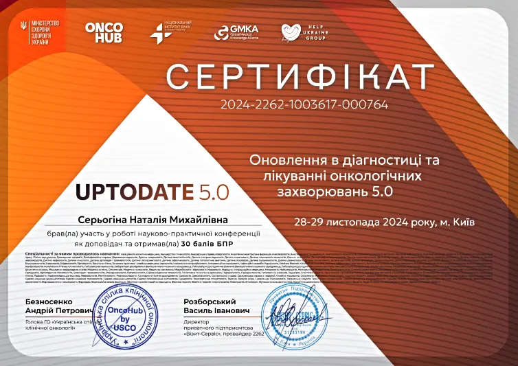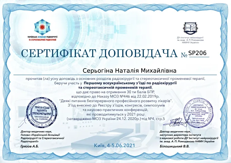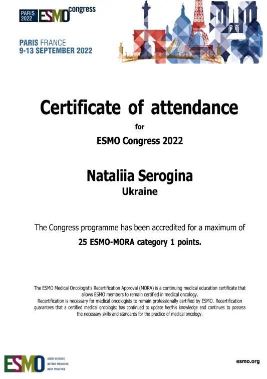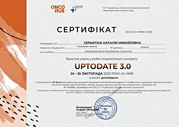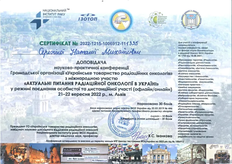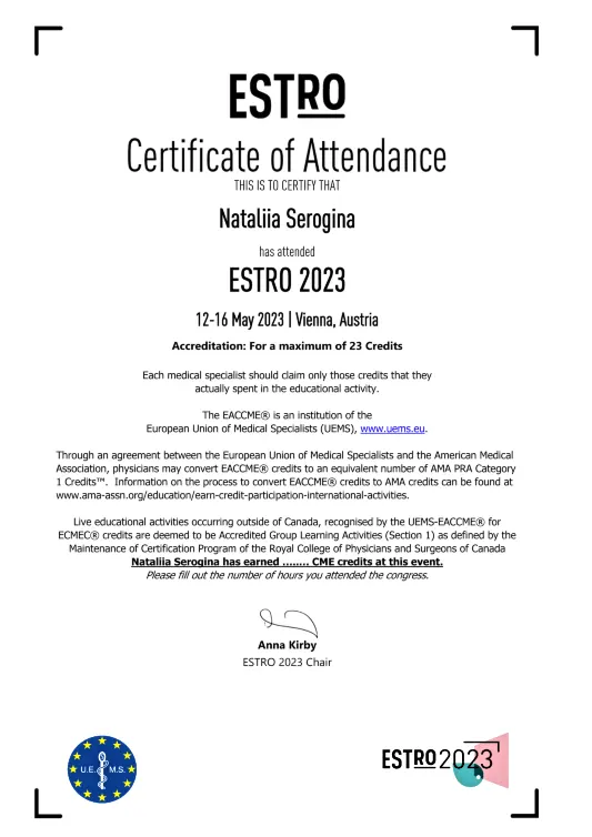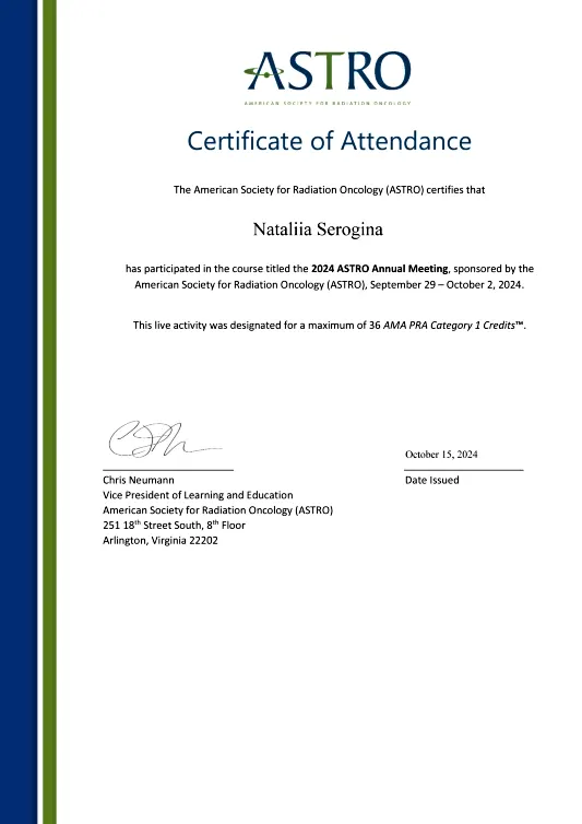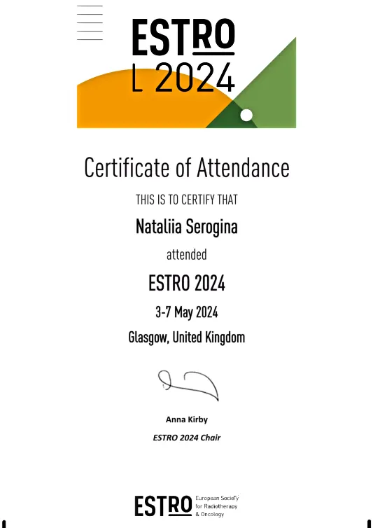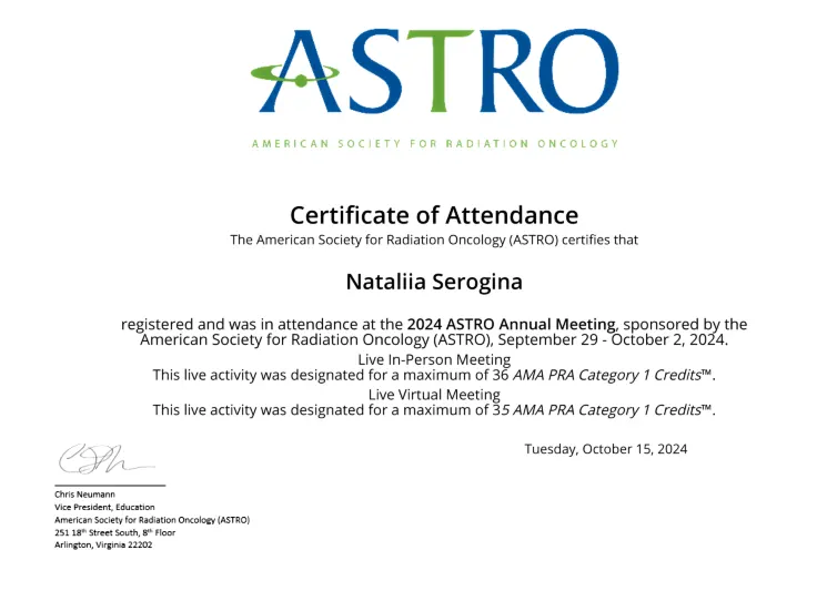ASTRO 2024Співавтор 15 науково-практичних статей. Неодноразово брала участь в міжнародних науково-практичних конференціях з онкології, променевої терапії.
